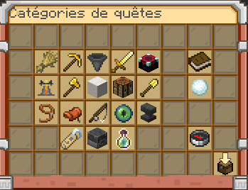 Utilise /quests pour ouvrir le menu des quêtes et voir les différentes catégories disponibles.